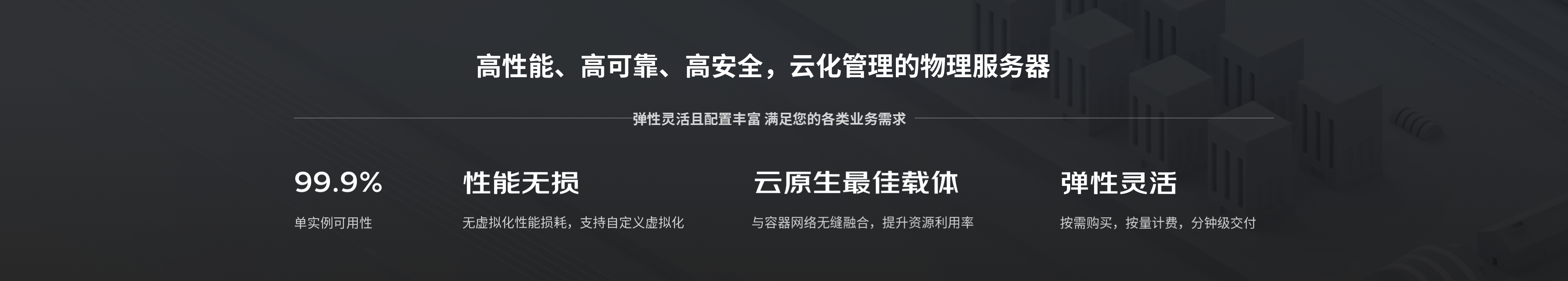 提供 7*24 小时运维服务,放心托管,如遇硬件故障问题匹配专业人员技术支持;独享物理服务器资源,无共享存储,无性能损失,无资源抢占,安全合规,所有数据尽在您自己掌控之中。